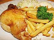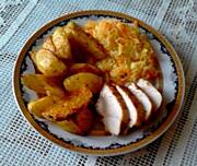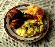 Podudzia z kurczaka pieczone,ziemniaki,surówka z kiszonej kapusty.