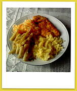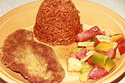 Dziś był Bahusowy czerwony ryż, filet w panierce i surówka mix z vinegretem.