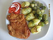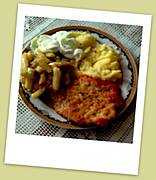 Kotlet schabowy,ziemniaki,mizeria,fasolka szparagowa z bułką tartą.
