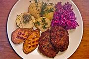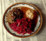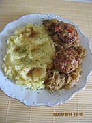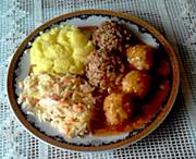 Pulpety w sosie,kasza mieszana gryczano - jęczmienna,ziemniaki,surówka z białej kapusty.