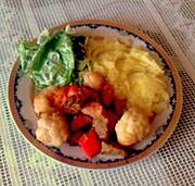 Filet z kurczaka w warzywach(cukinia,bakłażan,marchew,papryka,cebula,czosnek i tymianek) ,ryż naturalny i sos czosnkowy ...