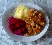 Wczoraj gulasz z indyka,ziemniaki i buraczki z chrzanem,dzisiaj filet z kurczaka w papirusie,ziemniaki pieczone,surówka z kiszonej kapusty.