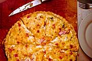 Quiche kalafiorowo-serowy z szynką i pieczonym czosnkiem.