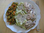 Gotowany kurczak (dolne pałeczki bez kostek i skórki ) w sosie pieczarkowym, pyreczki utarte z garścią kopru + groszek z marchęwką