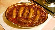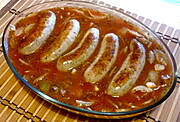 Biała kiełbasa zapiekana z fasolą w sosie pomidorowym - tu przed włożeniem do piekarnika, zapachy obłędne, a jak smakuje przekonamy się za jakiś czas..;)