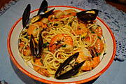 Wczorajszy barszcz z uszkami, na drugie spagetti z krewetkami, do picia kompot z jablek i brzoskwin