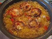 Przesolone bakłażany po włosku dla mnie, dla reszty: mój ulubiony ryż pełnoziarnisty z brokułami i papryką. Dzisiaj bez mięsa, dla odmiany po wczorajszym pysznym schabie wg Magdy(ityle). Ale mnie po tej soli suszy, dobrze, że dzisiaj czwartek i wypada chwycić "szklanki w dłoń"...