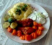 Podudzia z kurczaka pieczone, z marchewką,ziemniaki,mizeria,brukselka przysmażona na masełku z bułką tartą.
