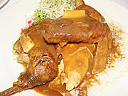 Królik w śmietanie z czosnkiem, szalotką i rozmarynem i kapusta zasmażana.