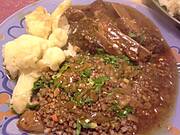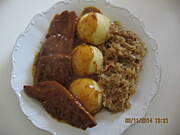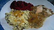Karkówka w sosie borowikowo-cebulowym (z bloga Aleex), ryż i buraczki albo ogórek kiszony.