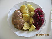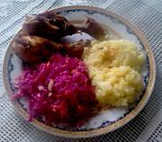 Wczoraj barszcz czerwony z ziemniakami,pierogi ruskie a dzisiaj podudzia z kurczaka,ziemniaki mi surówka z czerwonej kapusty.