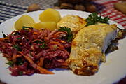 Schab w sosie,ziemniaki,surówka z kiszonej kapusty,buraczki zasmażane.