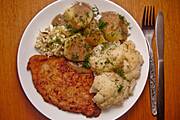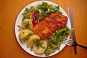 Kotlet drobiowy, ziemniaki z koperkiem, mix sałat z winegretem.