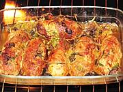 Piekłam w piekarniku przez ok 20 min. w najwyższej temperaturze, potem w 180 stop.przez 40 min w zakrytym naczyniu żaroodpornym.Pod koniec pieczenia zdjęłam pokrywę.Polecam...pychota :)