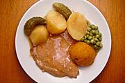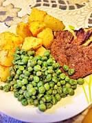 Bitki schabowe w sosie własnym, ziemniaki, puree z marchewki i pieczonego czosnku, zielony groszek, kiszone ogórki.