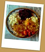 Wczorajszy barszcz czerwony z jajkiem i ziemniakami, golonka indycza na kapuście wg przepisu makusi (pychota!)..