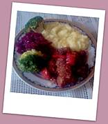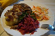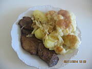 Wczorajszy kurczak z pieczarkami,ziemniaki,surówka z pora,marchewki i jabłka i surówka z czerwonej kapusty kiszonej,marchewki i jabłka ...
