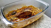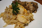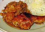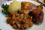Kurczak pieczony na kapuście kiszonej doprawionej jabłkiem i powidłami śliwkowymi