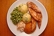 Smażone polędwiczki z kurczaka, puree ziemniaczane ze szczypiorkiem, puree z marchewki i pieczonego czosnku, zielony groszek w maślano-śmietanowym sosie, surówka.