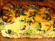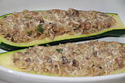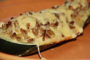 ...takie sprzątanie lodówki trochę, bo miałam kilka pieczarek i napoczętą paprykę zieloną, pół cebuli, trochę miąższu cukinii - to podsmażone. Dwie garstki mielonego, 3 łyżki gotowanego ryżu - wszystko wymieszane z odrobiną mieszanki śmietany 30% i jajka. Sypnięte serkiem na 5 min przed końcem pieczenia :)