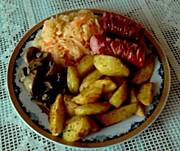 Wczoraj kotlet kurczęcy,ziemniaki,surówka porowo-marchewkowo-jabłkowa a dzisiaj kiełbasa przysmażana,ziemniaki pieczone,surówka z kiszonej kapusty.