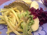 Klops, ziemniaki, fasolka, brokuł i buraczki z gruszką.