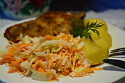 Rosół, cycek utaplany w bułce na ostro, surówka z marchwi, jabłka i pora z odrobiną chrzanu i cytryny, ziemniaki duszone.