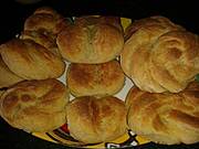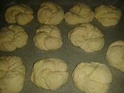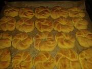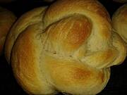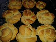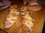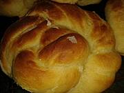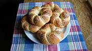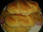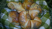 Bułki...do miski wsypać 350g mąki pszennej,150g mąki kukurydzianej,1 łyżeczkę soli,wymieszać.Zrobić zaczyn z 1,5 szkl mleka,pół paczki drożdży szczypty cukru i łyżki mąki,poczekać jak podrośnie.Do suchych składników dodać zaczyn , 4 łyżki oleju i wyrobić ciasto.Odstawić do wyrośnięcia.Formować bułki z dwóch wałeczków zaplatając je na przemian,końce skleić ze sobą .Piec ok 25-30 min.w 180 stop.