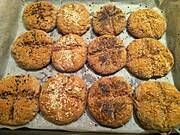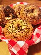 Dodaj pozostaly cukier, sol, wode i wyrob przez 15 minut elastyczne gladkie ciasto. Przykryj i odstaw w cieple miejsce do podwojenia objetosci. Odgazuj ciasto, podziel na 10 czesci. Z kazdej uformuj waleczek i owin go wokol 4 palcow, roluj obrecz, by konce polaczyly sie. Mozesz tez z kazdej czesci zrobic kulke, rozplaszczyc i zrobic dziurke wcsrodku, rozciagajac ja. W tym momencie do garnka wlej goraca wode i dodaj cukier/ miod ( niektore przepisy zalecaja tez lyzeczke sody), niech sie zagotuje. Przygotowane bajgle odkladaj do napuszenia na 15 minut. Po tym czasie delikatnie przekladaj, najlepiej pomjednym, ale nie wiecej niz 3 na raz do gotujacej sie wody, obgotuj z kazdej strony przez 30 sekund. Wyjmij, odluz na papierowy recznik do obeschniecia. Ukladaj na przygotowanej blasze, posmaruj ( lub nie) jajkiem, obsyp ziarnami. Wloz do rozgrzanego do 200 st C piekarnika i piecz do zrumienienia, okolo 10-15 minut.