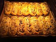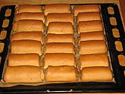 Po tym czasie przekładamy na posypany mąką blat, krótko wyrabiamy. Formujemy prostokąt 32x15 cm. Kroimy na 8 części (4x15). Układamy na blaszce w kilkucentymetrowych odstępach.