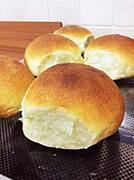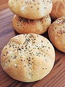 Wiadomo robimy zaczyn, dodajemy do maki, dosypujemy sol, dodajemy śmietankę, jajko i zółtko. Drugie białko wymieszane z lyzka wody posłuży do posmarowania bulek przed pieczeniem, chyba, ze zdecydujemy sie posmarowac wierzch bulek roztopionym maslem (3lyzki)zarówno przed jak i po upieczeniu, jeszcze gorace, wtedy do ciasta dodajemy 1 jajko. Wyrabiamy elastyczne gladkie ciasto, odstawiamy do podwojenia objetosci. Formujemy 10 rownych kul, kazda z nich splaszczamy na blasze, zostawiamy do wyraźnego napuszenia. Smarujemy białkiem lub maslem. Pieczemy w 190 st C przez ok 15 minut.