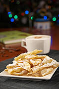 U nas kolejna faworkowa odsłona - z okazji sylwestra smażyłam chrusty z połowy porcji ciasta, resztę schowałam do lodówki w postaci kuli zawiniętej w woreczek i dziś powtórka z rozrywki. Przyjemnie tak sobie schrupać kopczyk karnawałowych słodkości do poobiedniej kawy - w tle skrzy się choinka, i kto by tam chciał wychodzić z domu na deszcz i wiatr :)