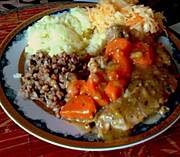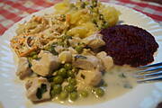 Potrawka z kurczaka i indyka z groszkiem zielonym ,surówka z marchewki,jabłka i pora,buraczki na ciepło i ziemniaki ...