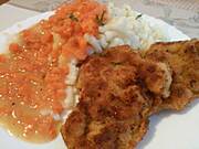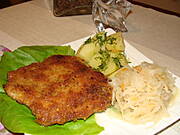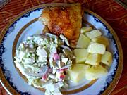 Kotlet z fileta kurczaka,ziemniaki,sałatka z buraczków i papryki.