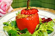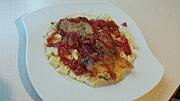 Karkówka faszerowana, mielone cielęco-wieprzowe, marchewka duszona i salsa piekielna.