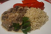 kurczak w sosie pieczarkowym na białym winie z czosnkiem, podany z ryżem