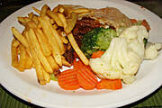 Grillowany stek z karkówki z serem, frytki, marchewka, kalafior, brokuły.