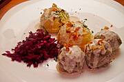 Pulpety wieprzowo-wołowe w sosie serowym, puree ziemniaczane, surówka z czerwonej kapusty + koperek + prażona cebulka.
