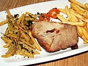 Pieczeń z karkówki, fasolka szparagowa zasmażana, frytki
