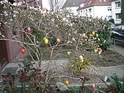 Pierwsze zdjęcie co prawda nie jest wiosenne - bo to krzak całoroczny - ostrokrzew, czubkiem sięgający moich okien. Niemniej bardzo go lubię. Na Boże Narodzenie obsypuje się czerwonymi kulkami - także wygląda jak choinka