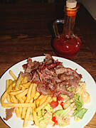 Obiad u Turka. Kebab barani, frytki i surówka. Do tego bardzo pikantny sos.