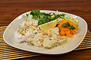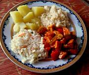 Schab z szybkowara w sosie, sałatka szwedzka od Toffik, ziemniaki