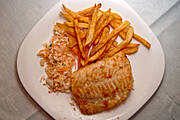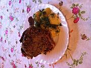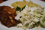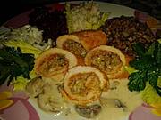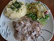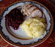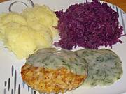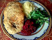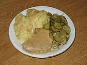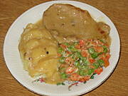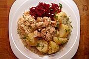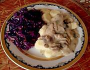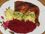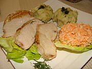 Wczorajsza pierś wg mggi63, o dziwo nic nie straciła na smaku i soczystości. Ziemniaki z gałką muszkatołową, smietanką, masłem i koperkiem, marechewka z jabłkiem i chrzanem.