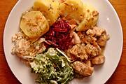 ziemniaki, kotlety z piersi kurczaka, surowka z czerwonej, kotlety mielone w sosie koperkowym, modra kapusta, bitki z indyka w sosie, buraczki z papryka