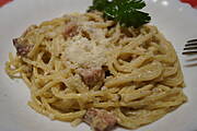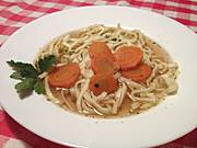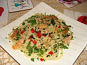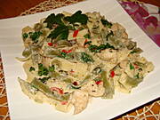 Makaron z sosem cytrynowo-śmietanowo-serowym, z papryczką peperonii i kawałkami kurczaka.