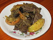 Gulasz wołowy ( bitki miałam zrobić ale Pani mięska nie miała dziś odpowiedniego na bitki ) + kasza gryczana a jak kasza gryczana - to tylko ogórasy kiszone :) tradycyjnie :)