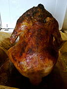 U Ciebie kaczusia, a u nas... bardzo fotogeniczny, dumny kurczak, z lewa, prawa, z przodu i z tyłu :) Do tego po gotowanym kartofelku ze świeżym, bo mrożonym koperkiem i surówką z pekinki...