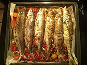 Patuś, proszę pytaj, co chcesz wiedzieć. Ja wsadziłam wszysttkie rybki na dużæ blachę od piekarnika, ale napiszę Ci co robiłam od początku. To najpierw warzywa, dałam takie: 3 duże papryki mogæ być różnego koloru, pokroiłam w większą kostkę, potem pokroiłam 3 marchewki, jedne w słupki, drugie w krążki, 1 por pokrojony też w krążki. Na blachę położyłam pergamin, a na nim rozłożyłam pokrojone warzywka, posypałam natkæ pietruszki, polałam trochę oliwy i wymieszałam. Każdą rybkę obsypałam pieprzem cytrynowym i solą himalajską, a w rozcięcia włożyłam lekko zmiażdziony, ale po 2 całe i obrane ząbki czosnku. Do środka włożyłam też po 4 gałązki świeżego koperki i po 2 gałązki świeżej natki pietruszki. Tak przygotowane rybki ułożyłam na warzywkach i jeszcze lekko je skropiłam oliwką oraz położyłam na każdej po plasterku masełka oraz po gałązce świeżego tymianku. Rybki przykryłam drugim papierem pergaminowym i tak piekłam je przez 20 minut, po tym czsie zdjęłam pergamin i dopiekałam je kolejne 20 minut. Ot i cały przepis. :-)