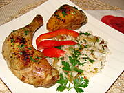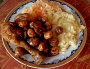Podudzia z kurczątka pieczone,ziemniaki,pieczarki podsmażone,surówka z kiszonej kapusty.