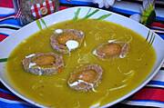 Dzisiaj- zupa cebulowa (z serkami topionymi) z grzankami czosnkowymi, na drugie- chleb smażony w jajku (chyba mnie Bóg opuścił w sobotę w piekarni, nie wiem, na cholerę nakupowałam tyle pieczywa).
